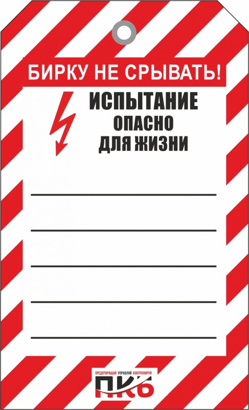 Информационная бирка "Испытание, опасно для жизни" арт. PKBS86, односторонняя. Изготовлена из пластика, без ламинации, толщиной 0,3 мм, без люверса, Ø отверстия 7 мм. По желании заказчика толщина бирки может быть увеличена до 1-2 мм. Нанесение текста можно производить маркером или ручкой. Размер 70 х 115 х 0,3мм.